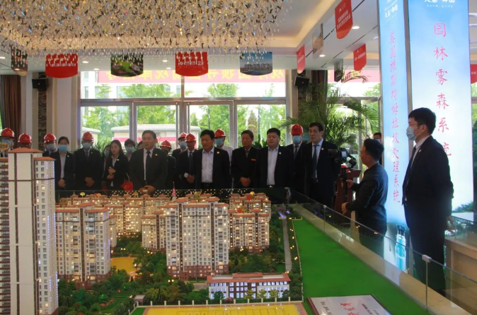 装饰一新的项目办公区,迎接观摩团的到来。在沂粮集团董事长兼总经理黄焱的带领下,全体员工日夜奋战,争分夺秒,仅用20天时间,便完成了营销中心和办公区域的装饰改造升级,5月1日正式启用,收获了“百日会战”的初步战果。