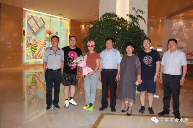 香港宝芝林集团董事局主席丁丁女士(左五),山东众合投资公司总经理陈红(左四),宝芝林集团董事局董事副总裁邓磊(左二)一行,在罗庄区委常委牛司正(左三),天基集团董事长黄金山(右四),天基集团副总经理黄焱(右二),罗庄区卫生健康局局长刘春(左一),罗庄区投资促进服务中心主任孙立宝(右三),山东蓝图家具制造有限公司董事长孙立勇(右一)等陪同下莅临天基黄金水岸参观考察