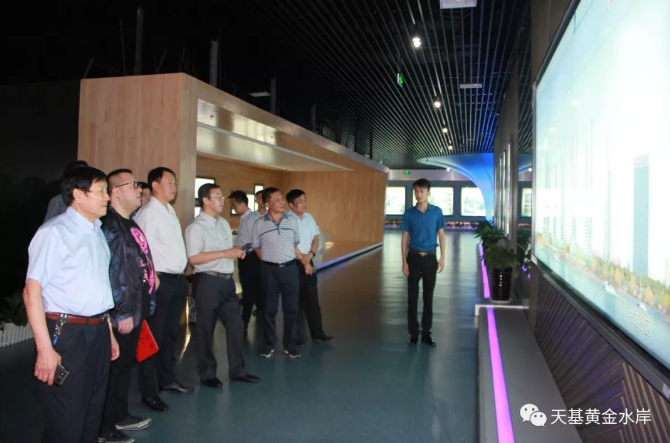 香港宝芝林集团邓总(左二)一行在罗庄区委常委牛司正(左三)、天基集团董事长黄金山(左一)等陪同下参观临沂规划展览馆,听取关于天基黄金水岸项目的介绍