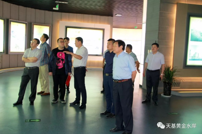 香港宝芝林集团邓总(左三)一行在罗庄区委常委牛司正(左五),天基集团董事长黄金山(右三),天基集团副总经理黄焱(右一)等陪同下参观临沂规划展览馆